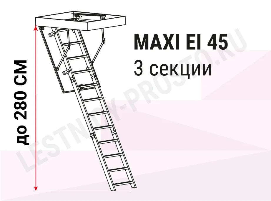 Модель лестницы MAXI EI45 идеально подходит для установки в помещениях подверженных возгоранию, её противопожарные свойства позволят эффективно изолировать помещение, в котором возник пожар, от чердака, тем самым предотвращая дальнейшее распространение огня. Лестница имеет в комплекте нескользящие насадки на ножки, которые идеально прилегают к полу, предотвращают появление царапин и придают лестнице эстетичный вид после ее резки (подгонки по высоте).