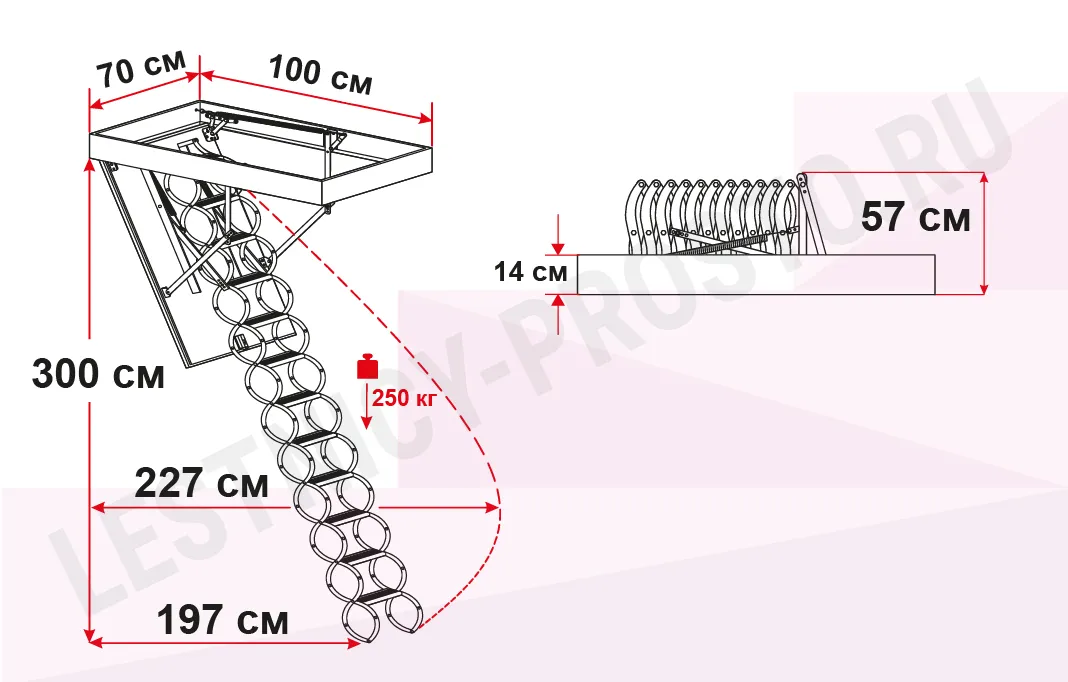 Крышка лестницы представляет собой многослойную конструкцию - деревянная рама, внутри которой находится пенопласт. Внутренняя часть крышки покрыта оцинкованной жестью, наружная часть белой эмалью и защитной пленкой. Толщина крышки 60 мм. Все соединяющие части изготовлены из твердого материала и имеют оцинкованное покрытие. Короб металлический высотой 140 мм., по периметру проходит уплотнитель. Ступени лестницы изготовлены из анодированной стали и покрыты порошковой краской, поверхность имеет антискользящие насечки и выдерживают нагрузку 150 кг.