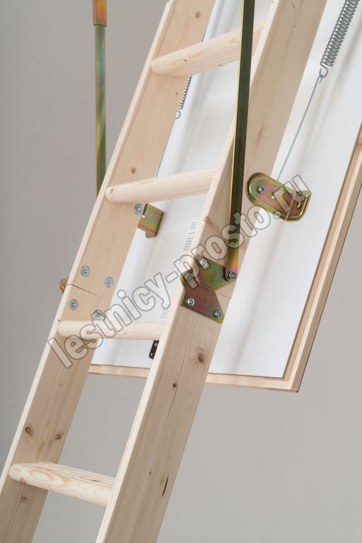 В комплекте: люк из сэндвич-панели, пружинный механизм "короб-люк", короб, трехсекционная лестница с сосновыми ступенями, замок люка, штанга для раскладывания лестницы.