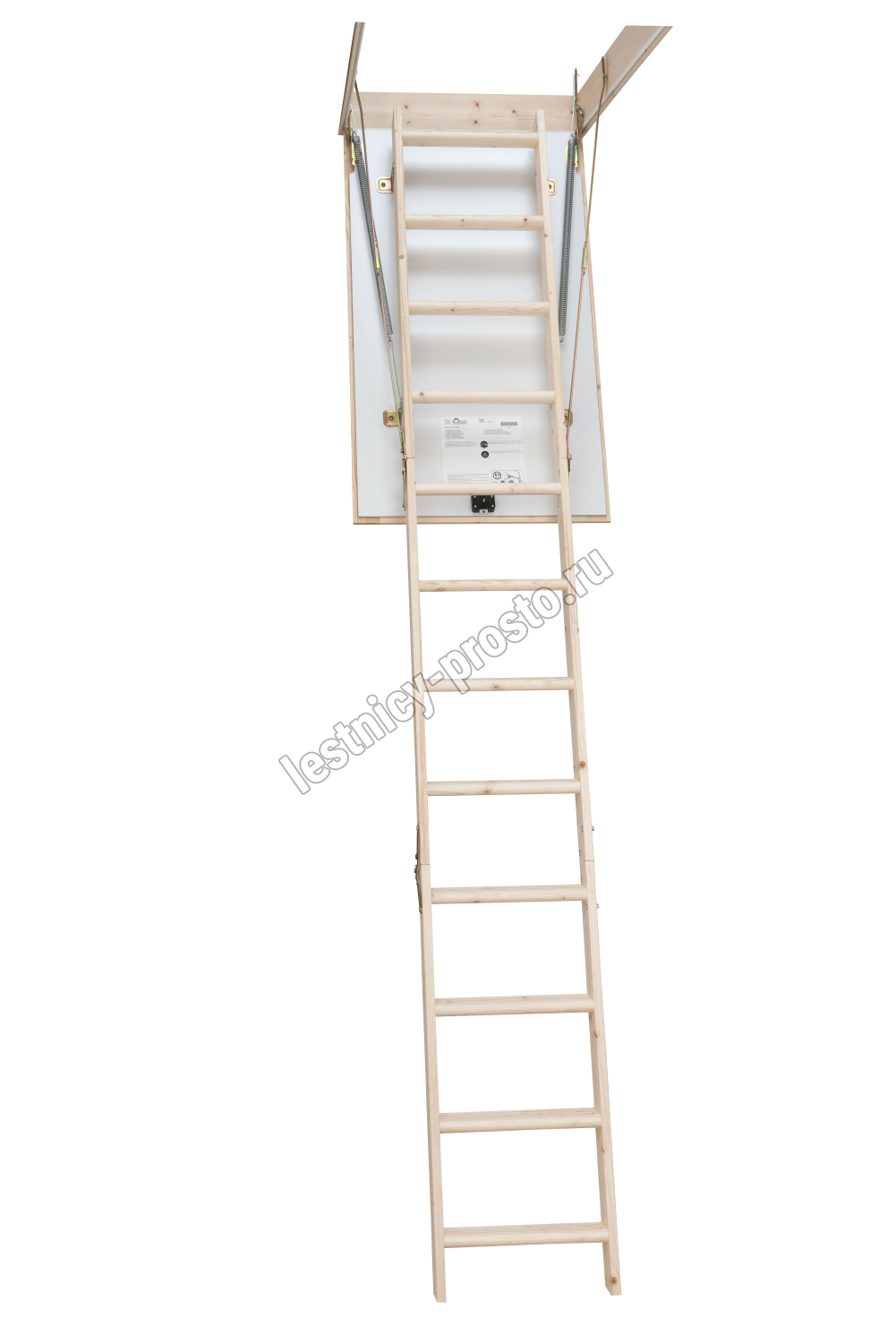 В комплекте: люк из сэндвич-панели, пружинный механизм "короб-люк", короб, трехсекционная лестница с сосновыми ступенями, замок люка, штанга для раскладывания лестницы.