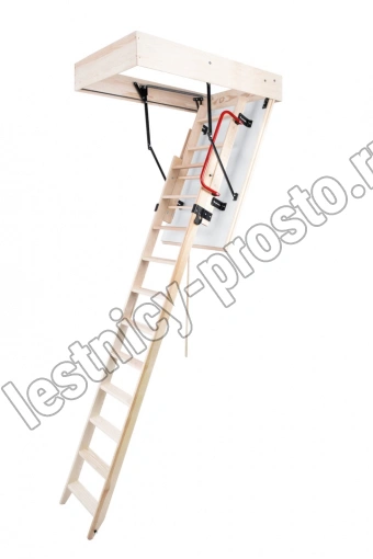 Лестница раздвижная двухсекционная, изготовлена из сосны. Термоизоляционная крышка типа "сэндвич" имеет усиленную теплозащиту, облицована с двух сторон ДСП белого цвета. По контуру короба имеется уплотнитель. Все металлические элементы лестницы покрыты порошковой краской, ступени лестницы имеют антискользящие насечки и закреплены в столярное соединение «ласточкин хвост», что позволяет выдерживать нагрузку 150 кг. При раскладывании лестницы нет вылета за пределы короба, что позволяет использовать эту модель лестницы в таких помещениях, где невозможно использовать чердачные лестницы с большим разбегом открытия. Удобна для эксплуатации на большой высоте. Деревянный стержень для открывания лестницы в комплекте..