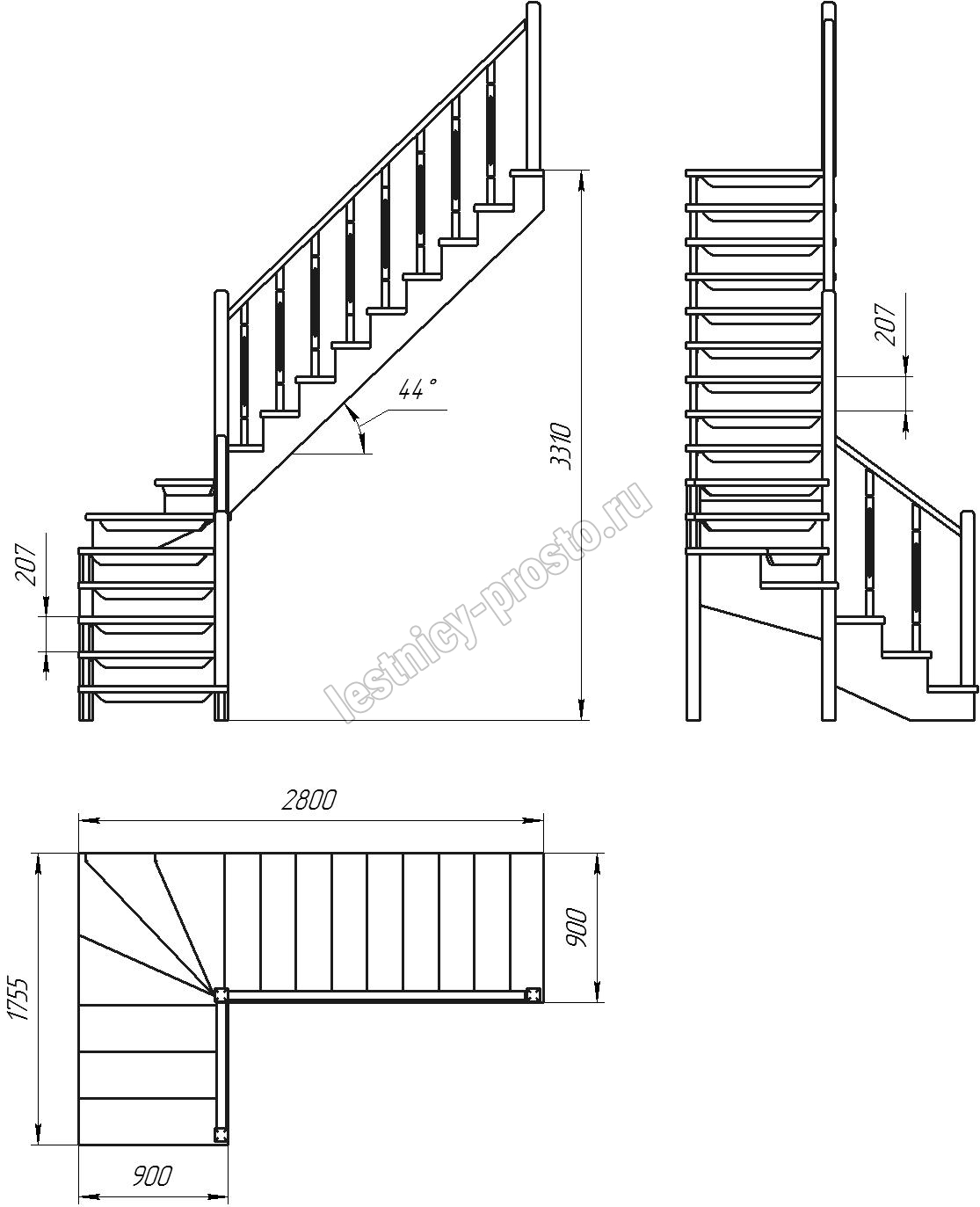 Удобная лестница на косоурах с поворотом на 90 градусов. Открытые ступени визуально облегчают конструкцию. Ограждения по всему маршу обеспечивают дополнительную безопасность и возможность декорирования. Монтаж осуществляется силами двух человек на объекте по указаниям, приведенным в паспорте на лестницу.