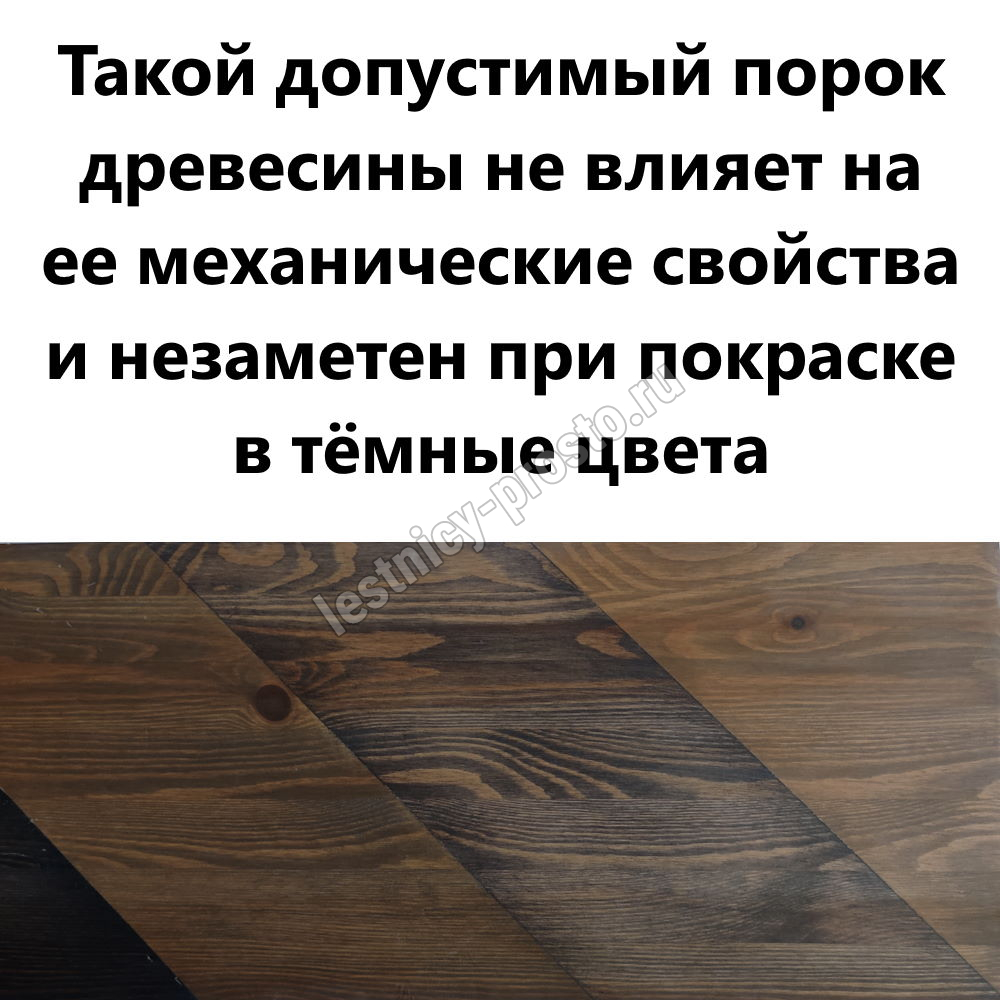Обратите внимание! Данный вариант лестницы изготовлен из сосны эконом-класса, имеющей заметные серые/синие вкрапления цвета - это не отражается на прочности лестницы, но может быть заметно при покраске в светлые тона.