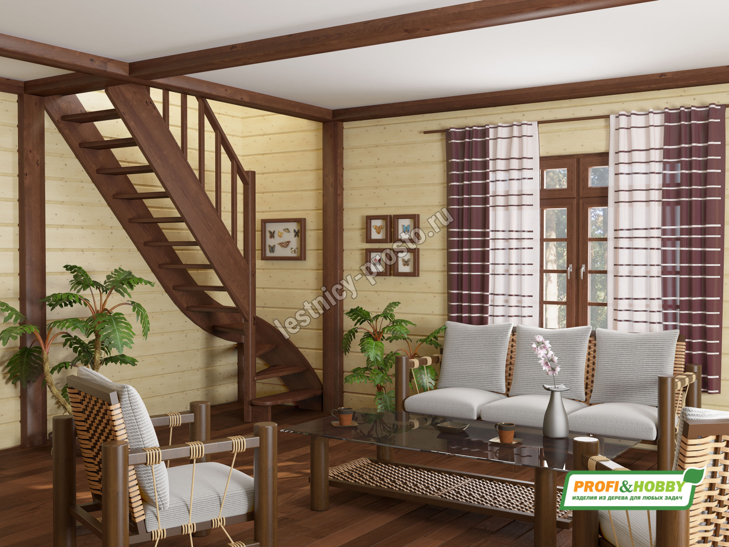 Базовый комплект включает в себя деревянные элементы лестницы с подступёнками и ограждения без какого-либо покрытия.