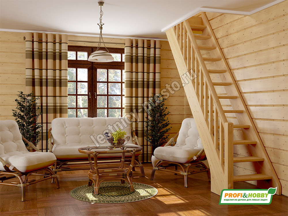 Базовый комплект включает в себя деревянные элементы лестницы и ограждения без какого-либо покрытия. Ограждение можно установить справа или слева.