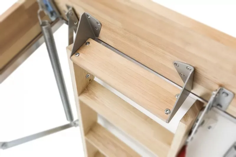 Ступени и поручень лестницы изготовлены из ясеня, остальные элементы из сосны.