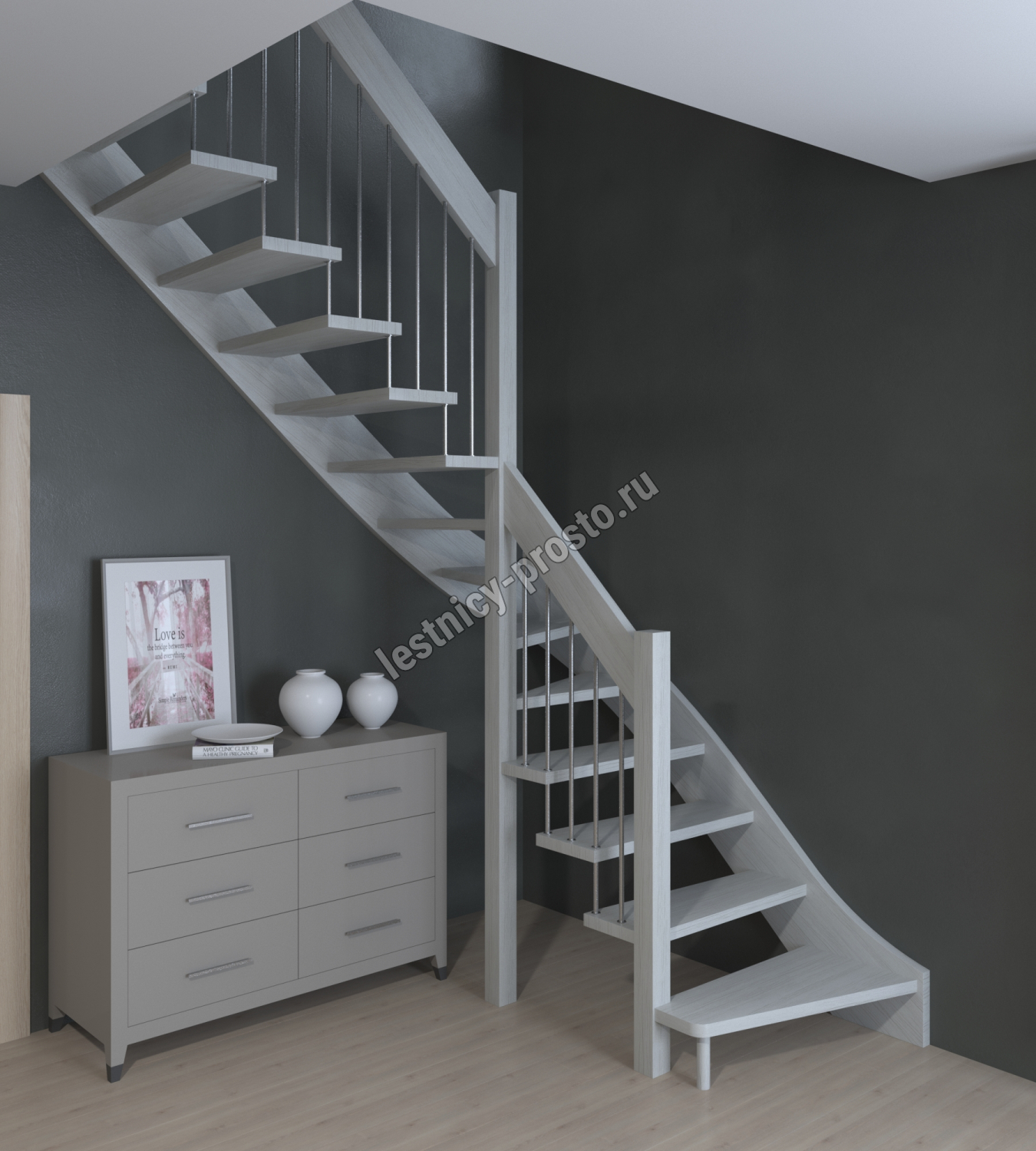 Надёжная современная лестница выполнена по немецкой технологии. Стоимость указана для лестницы с ограждением (с одной стороны); Поставляется в разобранном виде, в комплекте необходимый крепёж; Лестницу можно собрать самостоятельно; Так же, вы можете заказать услугу монтажа нашими специалистами; 4 вида породы дерева для изготовления лестницы: сосна, бук, ясень, дуб; возможна комбинированная лестница: из сосны (ступени бук, ясень, дуб); Деревянные элементы без какого-либо покрытия, отшлифованы, готовы к покраске. За дополнительную плату, вы можете изменить любые параметры, а именно: увеличить глубину ступени; увеличить ширину марша до 900 мм. и выше; заказать подступенки к лестнице; заказать отделку перекрытия (между 1-м и 2-м этажами); изготовить дополнительный промежуточный марш; заказать ограждение 2-го этажа; покраска в любой цвет или несколько цветов или покрытие защитными средствами; дополнение балясины из нержавеющей стали деревянными элементами; покраска балясин из нержавеющей стали порошковой краской в цвет RAL.