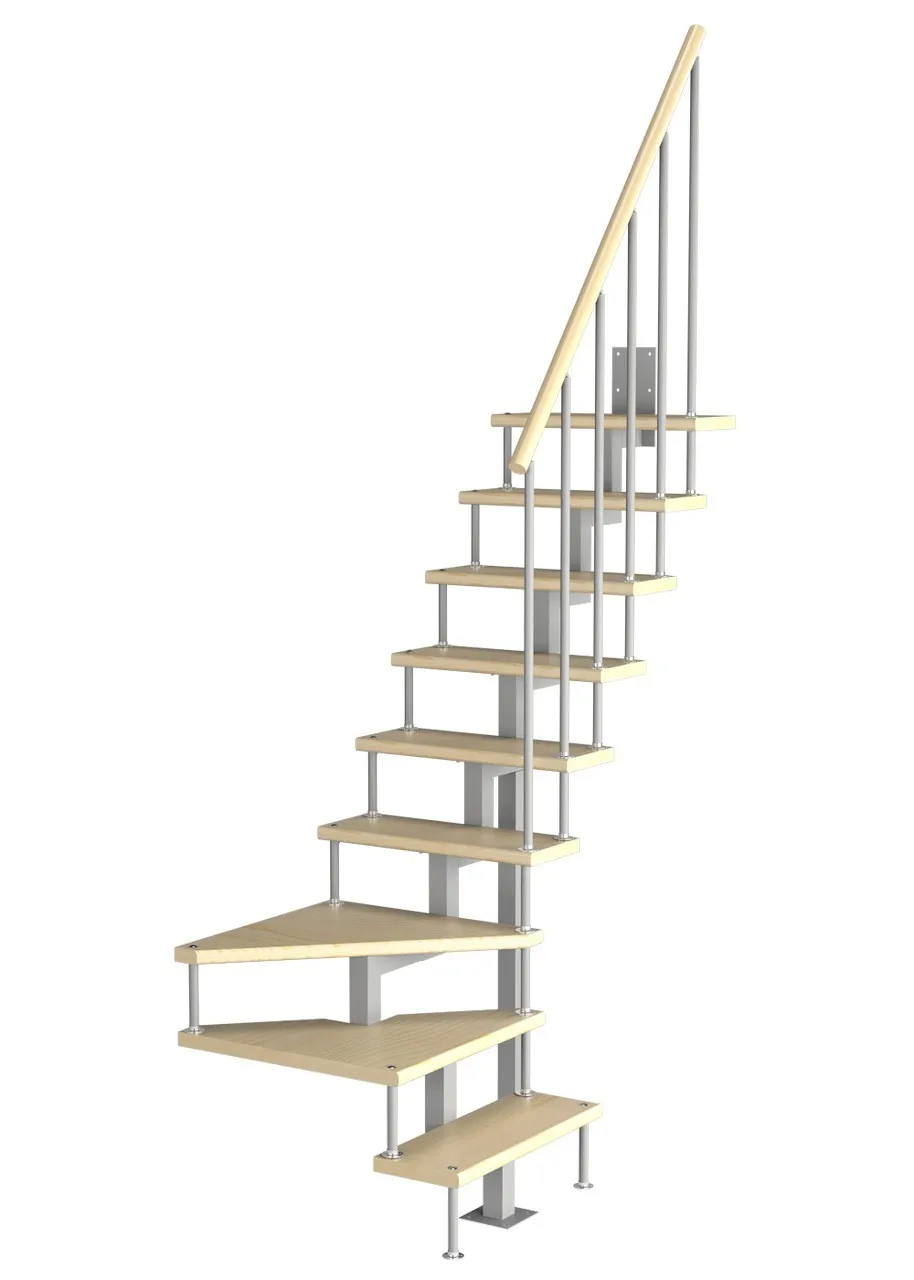 В комплекте: 3 прямых деревянных столба без какого-либо покрытия и профильный поручень без покрытия, комплект из 3 ригелей из стали (окрашены в цвет каркаса или хром по желанию) диаметром 12 мм. , необходимая фурнитура.