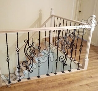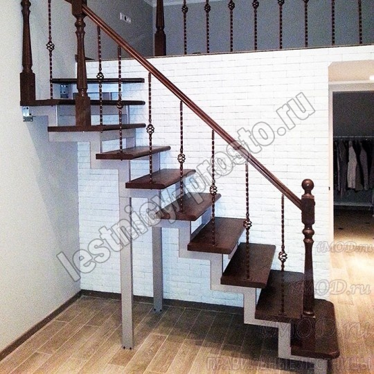 Кованые элементы и деревянные столбы можно выбрать по каталогу (после оформления заказа, мы вышлем вам фото образцов). Деревянные элементы: столбы и поручень по умолчанию идут без окрашивания, металлические элементы окрашены в цвет каркаса лестницы. Ограждение начинается со второй ступени.