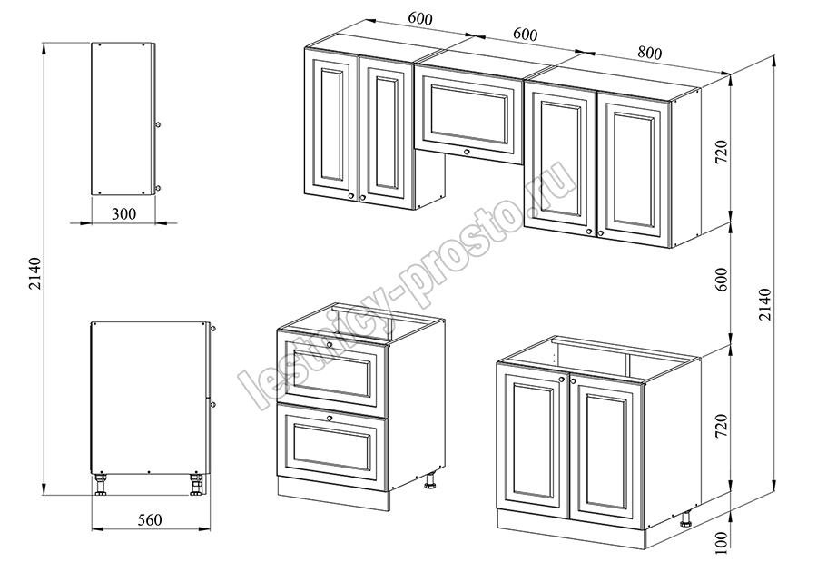 Благодаря модульной системе такая кухня может быть собрана зеркально. В стандартной комплектации нижние тумбы оснащены регулируемыми ножками высотой 100 мм и цоколем из массива сосны 95 мм.