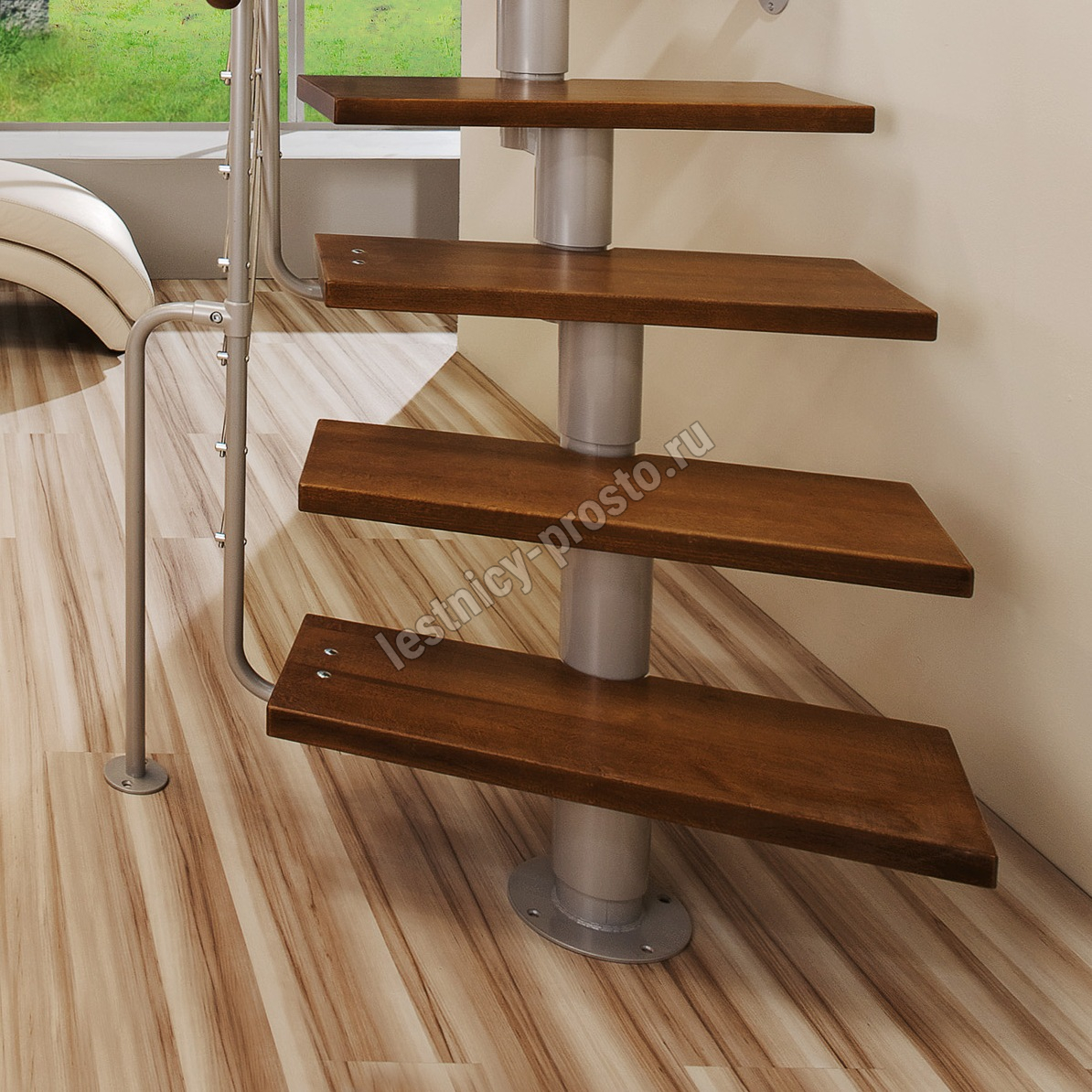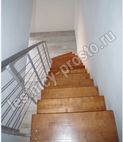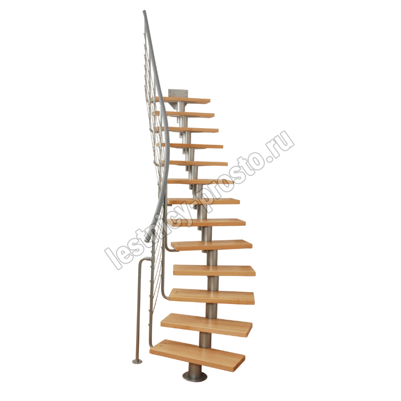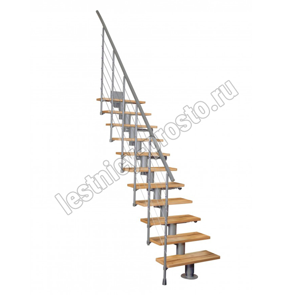 Лестница на стальном модульном каркасе. Высота лестницы регулируется при сборке засчет регулировки высоты шага. Ступени покрыты защитным лаком. Ограждение из стали с пластиковым поручнем. В комплект входят перила с вертикальными стойками и горизонтальными перегородками. Изделие поставляется с шурупами (кроме потолочных и напольных анкеров), инструкциями по монтажу и эксплуатации и гарантией. Внимание! Для этой лестницы необходимо крепление к стене.