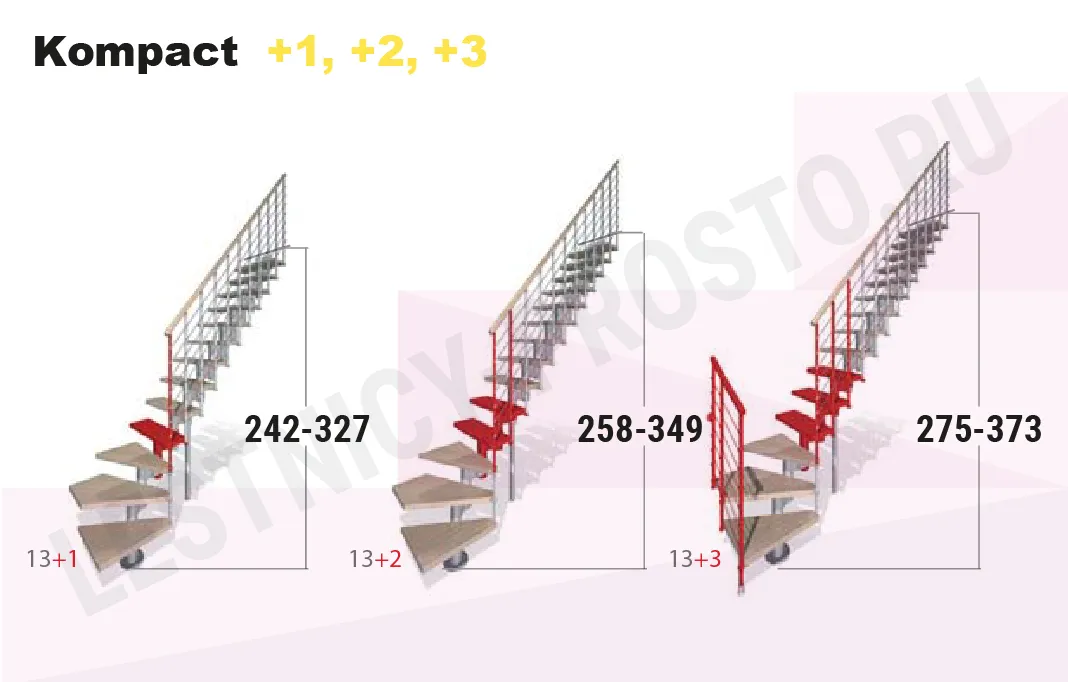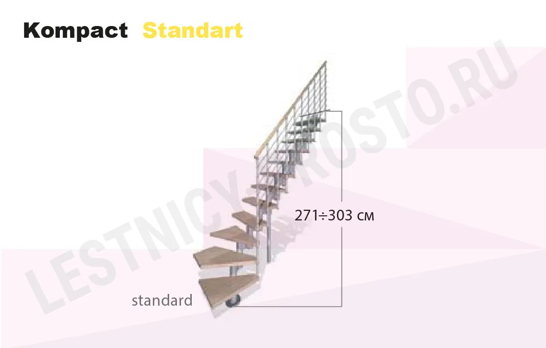 При монтаже этой лестницы, возможно регулировать высоту и глубину шага, таким образом можно получить лестницу под высоты этажа в диапазоне 2250 - 3030 мм, кроме того, установив дополнительный комплект увеличения высоты, можно поднять высоту лестницы до 3730 мм. Ширина проступи регулируется при монтаже в пределах 180 - 220 мм. Каркас и стойки ограждения выполнены из пластифицированного металла.
