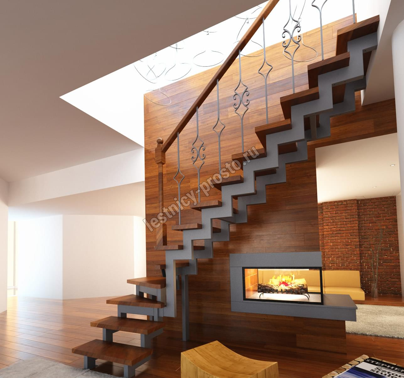 У данного варианта лестницы поворот реализован через забежные ступени. Под заказ возможно изготовление каркаса под поворотную площадку.