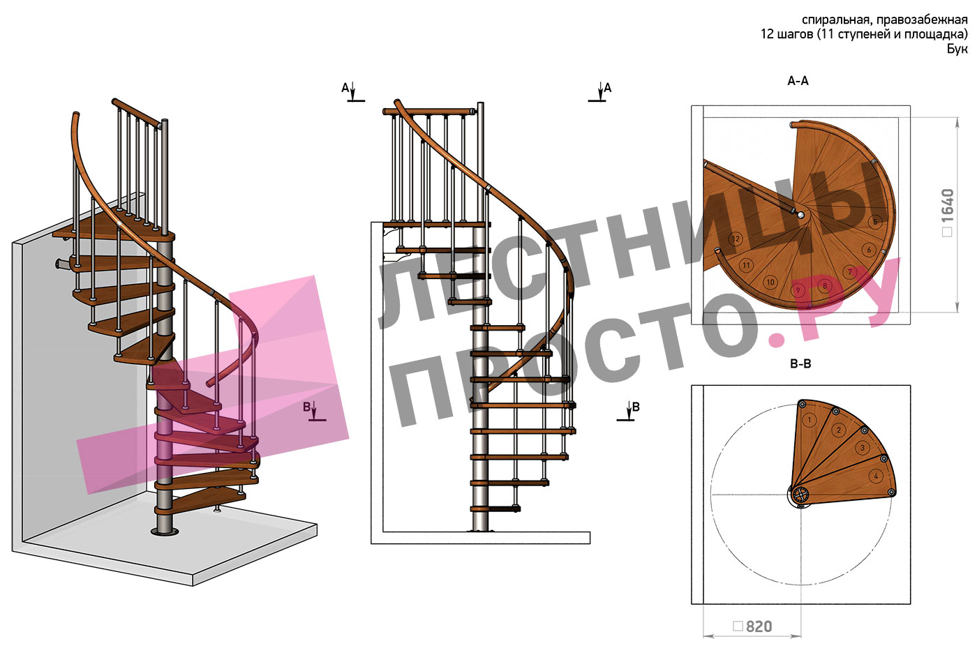 Правая, d=160см, 11 ступеней + площадка