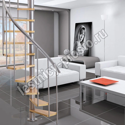 Ступени лестницы изготовлены из бука по технологии MULTIPLEX и покрыты износостойким защитным лаком. Лестница монтируется как по часовой стрелке, так и против. Возможен монтаж в круглый или квадратный проём. Ограждение: стальные трубки, Ø25 мм RAL 9006. Поручень: гибкий цельный ПВХ-поручень Ø40 мм серого цвета. Конструкция и балюстрада окрашены порошковым способом в серый цвет (RAL 9006).
